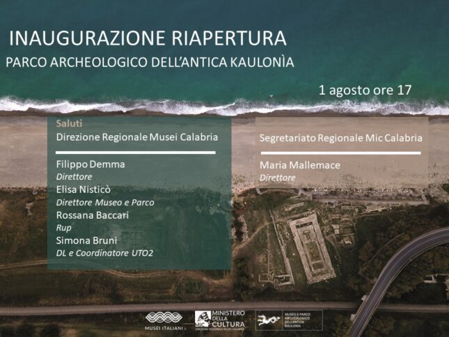 Riaprirà oggi, giovedì 1 Agosto a partire dalle ore 17:00, il Parco archeologico dell’antica Kaulonìa. Un evento cui prenderanno parte Filippo Demma, Direttore Regionale Musei Calabria, Elisa Nisticò, Direttrice del Museo di Monasterace e del Parco archeologico dell’Antica Kaulonìa, il Rup dei lavori Rosanna Bacari e Simona Bruni, Direttore dei lavori e coordinatore Uto 2 oltre a Maria Mallemace, responsabile del Segretariato regionale del Mic Calabria.