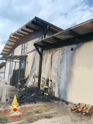 Le fiamme hanno interessato alcune pedane accatastate all’esterno della struttura, propagandosi ai pannelli coibentati di copertura delle pareti esterne del capannone, interessando parzialmente anche il tetto con struttura portante in legno e copertura con pannelli coibentati.