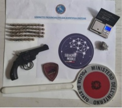 CROTONE La polizia di stato lunedì scorso ha tratto in arresto un commerciante crotonese trovato in possesso di una pistola revolver con matricola abrasa occultata all’interno della propria attività commerciale. Gli agenti, con l’aiuto del personale della Squadra Mobile, nell’ambito di servizi mirati, hanno effettuato una perquisizione all’interno dell’attività commerciale del soggetto, rinvenendo la predetta pistola, perfettamente funzionante, all’interno di un calzino, nonché 47 cartucce. La successiva perquisizione a casa dell’uomo ha portato poi al rinvenimento di 8 grammi di hashish, per i quali si è proceduto alla segnalazione al prefetto. Sempre nella giornata di lunedì, un uomo già noto alle forze dell’ordine per i suoi precedenti, è stato denunciato in stato di libertà per porto abusivo di armi o oggetti atti ad offendere, poiché trovato in possesso di un coltello a serramanico della lunghezza complessiva di 16 cm, nonché segnalato al prefetto in quanto trovato in possesso di diversa sostanza stupefacente. Segnalati al prefetto altri tre soggetti trovati in possesso di sostanza stupefacente.