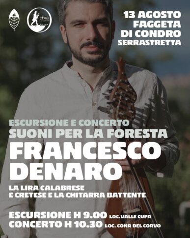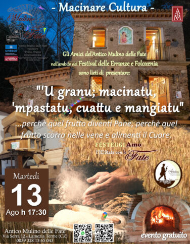 Si prosegue, alle ore 10,30, con l’ormai classico “Concerto per la foresta” alla Cona del Corvo, con gli strumenti musicali della tradizione mediterranea di Francesco Denaro: lira calabrese, lira cretese, chitarra battente, sempre con l’organizzazione di Edrevia e della Proloco di Serrastretta. Chi vuol partecipare al solo concerto, può giungere nelle immediate vicinanze della Cona del Corvo (una conca che funge da anfiteatro naturale nella Faggeta di Condrò) sempre dal Passo di Condrò, seguendo i segnali predisposti. Per chi proviene da Lamezia Terme, al passo-quadrivio, prendere la strada asfaltata a sinistra e proseguire sino a dove finisce l’asfalto. Da lì proseguire a piedi lungo la sterrata per cinque minuti ed entrare nella foresta a sinistra. Nel pomeriggio, all’Antico Mulino delle Fate di Lamezia Terme, alle 17,30, organizzata dalla omonima associazione, grande festa del pane “U granu, macinatu, ‘mpastatu, cuattu e mangiatu”, con tanti intrattenimenti culturali e musicali, le caprette e gli asinelli del Mulino e, soprattutto, la Fata Gelsomina.
