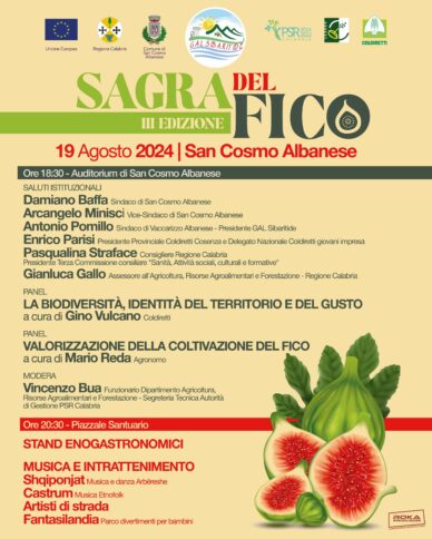 SAN COSMO ALBANESE Tutto pronto per la terza edizione della Sagra del Fico, in programma il 19 agosto 2024 a San Cosmo Albanese (Cs). La tradizione si rinnovaper celebrare il frutto citato anche dall’Abate Gioacchino da Fiore: «Nientemeno più prezioso, e per la copia e per la perfezione egli è il raccolto dei fichi (…) nere, bianche, altre brune, altre rossaccie, tutte però così dolci, che filano dalla creduta bocca stille di miele, e come se per filarlo non bastasse una sola apertura sul capo, sovvente ancora si stracciano per i fianchi». La manifestazione promossa dal Comune di San Cosmo Albanese e dal Gal Sibaritide offrirà spunti di riflessione sul valore dei fichi, risorsa economica e sociale dell’intera provincia di Cosenza. Un prezioso patrimonio da valorizzazione attraverso un evento come quello in programma a San Cosmo Albanese, utile a far conoscere le caratteristiche di un frutto unico. L’attività è realizzata nell’ambito del progetto di cooperazione filiere corte e mercati locali cofinanziamento F.E.A.R.S. – Misura 19.3 e coordinata da Roka Produzioni – Eventi&Comunicazione Creativa.
