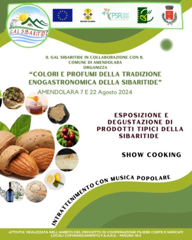 AMENDOLARA Se dici mandorla in Calabria la mente corre veloce ad Amendolara. Dopo lo straordinario successo del 7 agosto scorso, torna l’atteso appuntamento con “Colori e profumi della tradizione enogastronomica della Sibartide”, l’evento organizzato dal Gal Sibartide in collaborazione con l’amministrazione comunale di Amendolara. Il progetto è coordinato da Roka Produzioni – Eventi&Comunicazione Creativa.