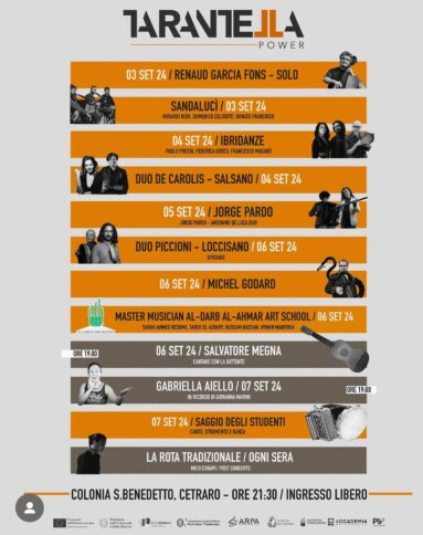 Le attività e si svolgeranno nel Centro residenziale Colonia San Benedetto, in via Suor Crocifissa Militerni. I partecipanti ai laboratori del “Tarantella Power” avranno l’opportunità di ottenere un certificato rilasciato dal Conservatorio, valido come credito formativo, confermando l’alto valore educativo dell’evento.