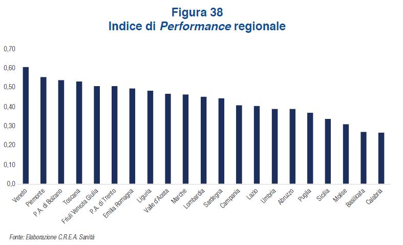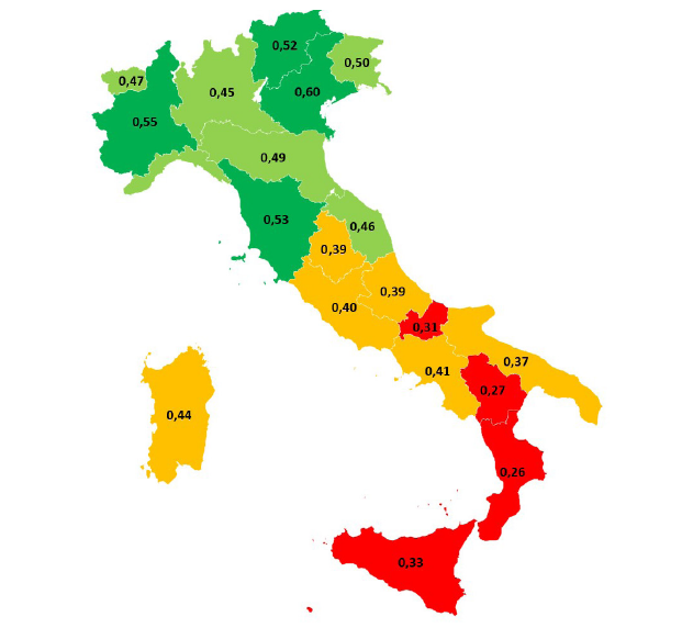 Qualitativamente, nel ranking si identificano quattro gruppi di Regioni: quattro Regioni, (verde nella mappa) Veneto, Piemonte, P.A. di Bolzano e Toscana, raggiungono livelli complessivi di tutela significativamente migliori dalle altre, con un indice di performance che supera il 50% di quella massima (rispettivamente 60%, 55%, 54% e 53%). Nel secondo gruppo (verde chiaro), troviamo sette Regioni con livelli dell’indice di performance abbastanza omogenei, compresi tra il 50% ed il 45%: Friuli Venezia Giulia, P.A. di Trento, Emilia Romagna, Liguria, Valle d’Aosta, Marche e Lombardia. Nel terzo gruppo (arancione) si attestano Sardegna, Campania, Lazio, Umbria, Abruzzo e Puglia, con livelli di performance compresi nel range 37-44%.