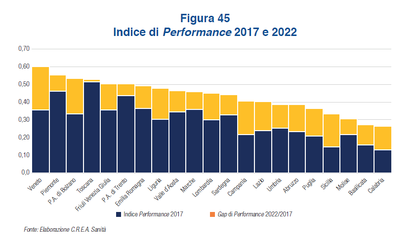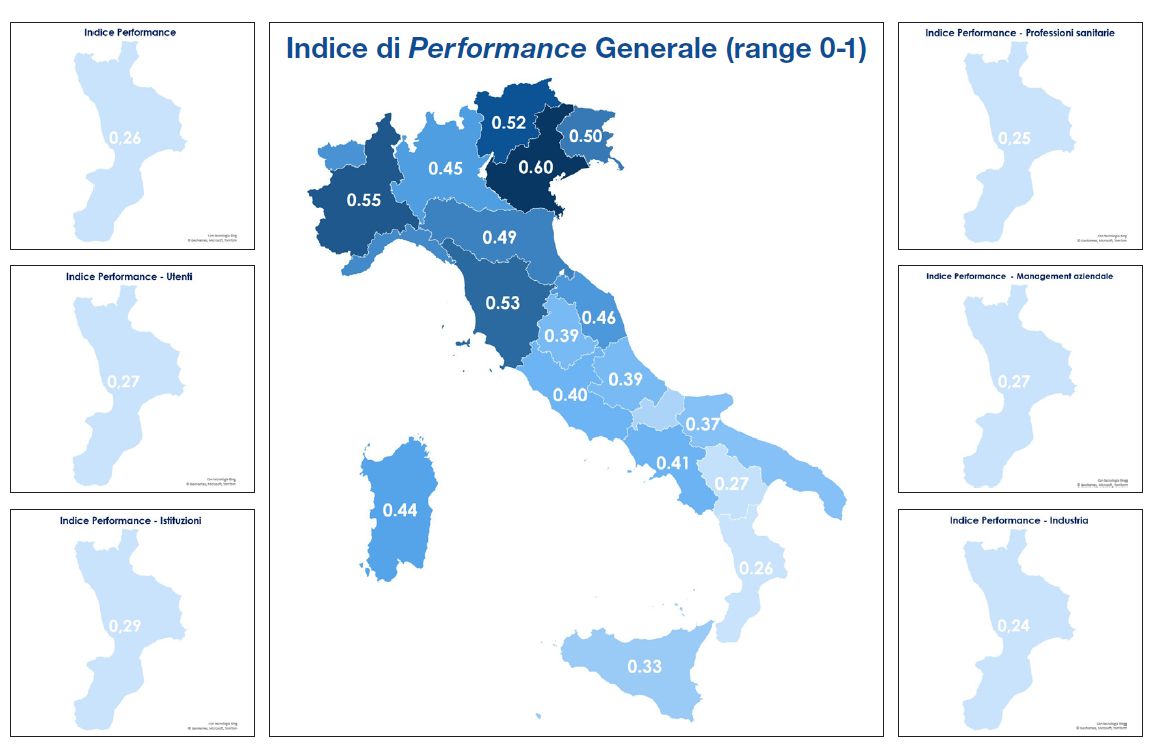 Ad analizzare i dati raccolti in ambito sanitario è la XII edizione (2024) del progetto promosso da C.R.E.A. Sanità “Opportunità di tutela della Salute: le Performance Regionali”. Nell’ultima edizione del progetto – che «dal 2012 fornisce un contributo alla definizione delle politiche sanitarie e sociali, con la finalità ultima di promuovere miglioramenti nelle opportunità di tutela socio-sanitaria offerte nei diversi luoghi di residenza regionale» – l’Expert panel conta 104 componenti afferenti a 5 categorie di stakeholder, affiancati da due supervisor: Industria medicale, Istituzioni, Professioni sanitarie, Management aziendale e Utenti.
