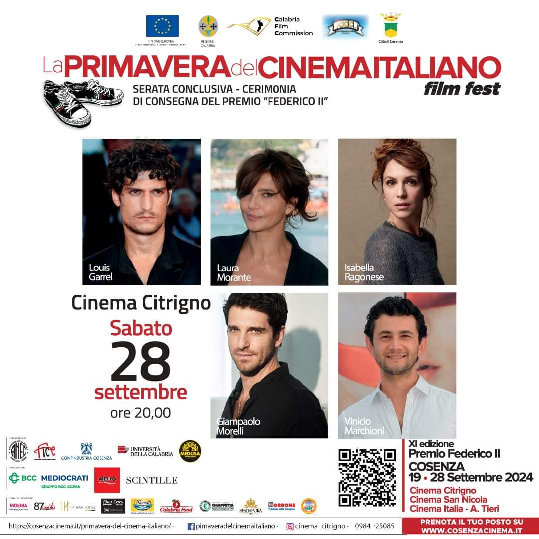 Louis Garrel, Laura Morante, Isabella Ragonese, Giampaolo Morelli e Vinicio Marchioni saranno gli ospiti dell’ultima serata de “La Primavera del Cinema Film Fest – Premio Federico II”, che si terrà sabato 28 settembre, alle ore 20.00, al Cinema Citrigno di Cosenza. Intervistati dal giornalista Rai Massimo Proietto, ci racconteranno ciò che avviene dietro la macchina da presa, le esperienze sui set, aneddoti e curiosità sulla loro vita professionale.