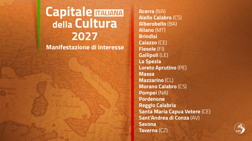 ROMA Il ministero della Cultura ha reso noto che sono 17 le città che hanno perfezionato la propria candidatura a Capitale italiana della Cultura 2027, dopo aver presentato la proposta progettuale entro la scadenza del 26 settembre prevista dal bando. Di seguito l’elenco delle città con il relativo titolo del dossier: Acerra (provincia di Napoli, Campania) “I Segreti di Pulcinella”; Aiello Calabro (provincia di Cosenza, Calabria) “Ajello terra antica et grossa et nobile et civile…”; Alberobello (provincia di Bari, Puglia) “Pietramadre”; Aliano (provincia di Matera, Basilicata) “Terra dell’altrove”; Brindisi (Puglia) “Navigare il futuro”; Caiazzo (provincia di Caserta, Campania) “La bellezza delle piccole cose”; Gallipoli (provincia di Lecce, Puglia) “La bella tra terra e mare”; La Spezia (Liguria) “Una cultura come il mare”; Mazzarino (provincia di Caltanissetta, Sicilia) “Mazaris, il grano e le identità plurali”; Morano Calabro (provincia di Cosenza, Calabria) “Morano Calabro: Le Quattro Porte del Sapere. Un Viaggio tra Cultura, Scienza, Natura e Spiritualità”; Pompei (provincia di Napoli, Campania) “Pompei Continuum”; Pordenone (Friuli Venezia Giulia) “Pordenone 2027. Città che sorprende”; Reggio Calabria (Calabria) “Cuore del Mediterraneo”; Sant’Andrea di Conza (provincia di Avellino, Campania) “Incontro tempo”; Santa Maria Capua Vetere (provincia di Caserta, Campania) “Cultura Regina Viarum – Spartacus Resurgit”; Savona (Liguria) “Nuove rotte per la cultura”; Taverna (provincia di Catanzaro, Calabria) “Bellezza interiore”. I dossier, che contengono il progetto culturale della durata di un anno, inclusivo del dettaglio del cronoprogramma e delle singole attività previste oltre che della valutazione di sostenibilità economico-finanziaria, saranno valutati da una giuria di esperti che esaminerà le candidature e selezionerà un massimo di dieci finaliste entro il 12 dicembre 2024. Tra le finaliste verrà scelta la città vincitrice per il 2027 dopo le audizioni pubbliche, che dovranno svolgersi entro il 12 marzo 2025, per la presentazione e l’approfondimento del dossier di candidatura alla giuria. La proclamazione della Capitale italiana della Cultura si terrà entro il 28 marzo 2025. La vincitrice riceverà un contributo finanziario di un milione di euro per realizzare gli obiettivi perseguiti dal progetto di candidatura e far diventare il dossier un programma di azione per mettere in mostra, nel periodo di un anno, la propria ricchezza culturale e attuare le possibilità di sviluppo offerte dalla nomina.