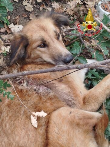 CROTONE Questo pomeriggio intorno alle 14:00 la squadra dei vigili del fuoco del distaccamento di Petilia Policastro è intervenuta per una richiesta di recupero cane. Giunti sul posto a Filippa di Mesoraca i vigili del fuoco si sono trovati davanti ad un cane che correndo in zona impervia si era attorcigliato sul corpo un cavetto d’acciaio, lo stesso nel cercare di liberarsi peggiorava le cose stringendo il cavo tra il suo corpo ed un albero procurandosi ferite profonde sul dorso. L’intervento dei vigili del fuoco, non facile visto lo stato dell’animale che in quelle condizioni non si lasciava avvicinare, è stato delicato, con cautela si tagliava il cavetto d’acciaio si liberava dalla stretta presa e si consegnava alle cure della protezione animali arrivati da Cirò Marina.