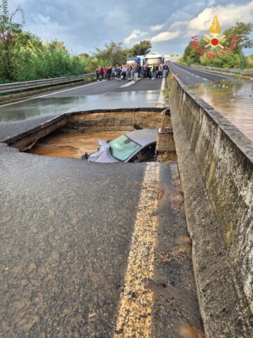«Restate a casa e non mettetevi in viaggio», il monito del primo cittadino. Come si evince dal video presente nell’articolo, una vettura è stata letteralmente inghiottita in una voragine aperta sulla Strada statale 280. All’interno dell’automobile, una ragazza di 25 anni salvata grazie all’intervento di alcune persone che l’hanno estratta prima che sprofondasse. I Vigili del fuoco con l’ausilio di mezzi messi a disposizione dai privati stanno provvedendo a liberare i percorsi alternativi bloccati da detriti e alberi abbattuti sulla sede stradale. L’auto è stata recuperata dopo alcune ore.