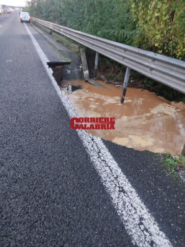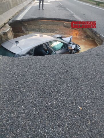 Si apre una voragine sulla Ss 280 dei Due Mari, auto inghiottita dall’asfalto – VIDEO E FOTO