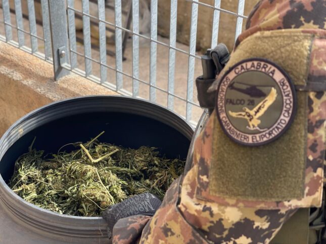 VIBO VALENTIA Prosegue senza sosta l’impegno dei Carabinieri nel contrasto alla coltivazione e al traffico di droga nel Vibonese, sotto la supervisione della Procura della Repubblica di Vibo Valentia guidata da Camillo Falvo. Nei giorni scorsi, i Carabinieri della Stazione di Nardodipace insieme allo Squadrone Eliportato Cacciatori “Calabria”, hanno individuato, in un’area demaniale nascosta tra la vegetazione, un contenitore con infiorescenze e piante di cannabis indica essiccate, per un peso complessivo di circa 30 kg. Sul mercato, tale quantità avrebbe fruttato circa 60 mila euro.