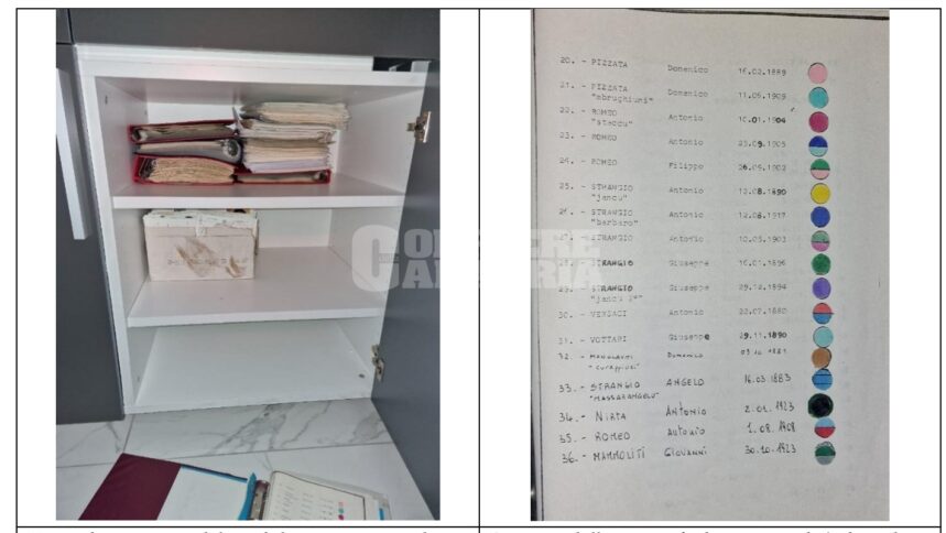 Quello che si trovano davanti è un vero e proprio “archivio di Polizia”, fatto da centinaia di documenti riservati, atti di polizia giudiziaria, ma anche verbali di collaboratori di giustizia, schede d’indagine sui principali gruppi criminali e schede di dattiloscopia. In particolare, all’interno di un mobiletto, la pg individua alcune schede di foto segnaletiche e modulari contenenti mappe delle principali famiglie di ‘ndrangheta. Ma non è tutto. Gli agenti, infatti, trovano anche un registro delle anagrafi dei gruppi di ‘ndrangheta calabrese: i Pizzata, i Romeo, gli Strangio. E poi Vottari, Strangio, Nirta e Mammoliti, insomma: nomi e cognomi delle principali ‘ndrine e tra i protagonisti assoluti degli scenari criminali degli ultimi decenni.