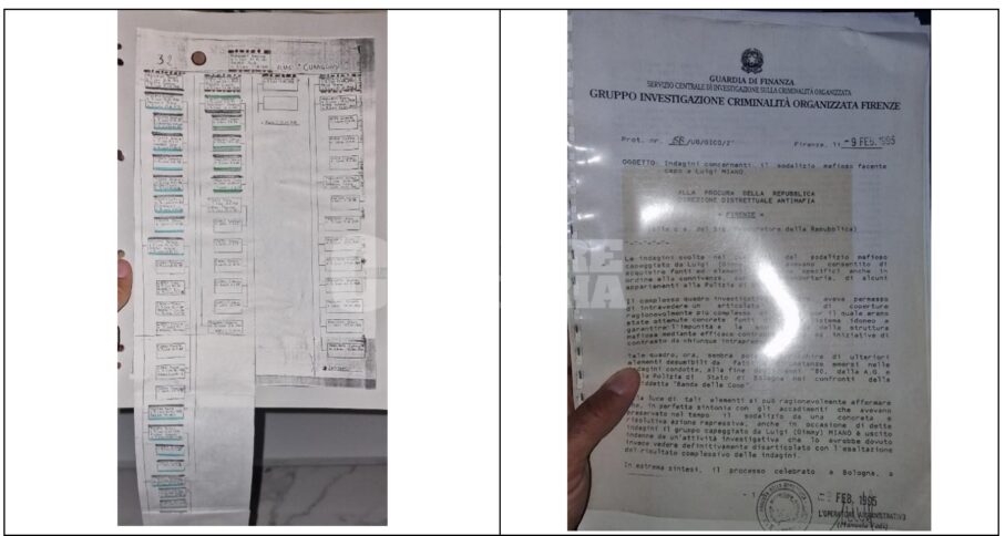 E non manca, poi, l’albero genealogico dei Mammoliti, altra potente famiglia di ‘ndrangheta così come una nota del 9 febbraio del 1995 del GICO di Firenze indirizzata alla Dda del capoluogo toscano sul sodalizio mafioso facente capo a Luigi Miano detto “Gimmy”, classe ’50 di Catania boss della mafia catanese dei Cursoti. Nell’archivio ispezionato dagli agenti della pg c’è anche il cartellino con foto segnaletica di Demetrio Latella, reggino classe ’54 con numerosissimi precedenti di polizia anche per associazione a delinquere di tipo mafioso, con tanto di dati di polizia contenuti in una cartella, e alcuni volumi contenenti gli interrogatori di Saverio Morabito (cl. ’52), collaboratore di giustizia e membro del gruppo Sergi-Papalia.