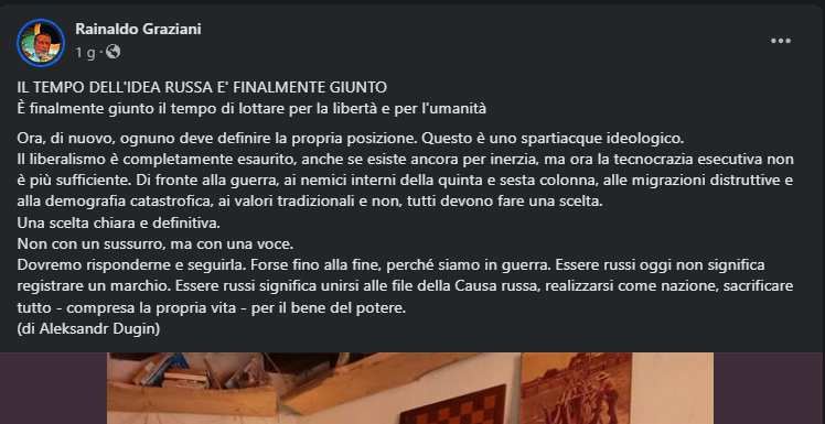 Un piccolo centro della provincia di Crotone, uno come tanti del Sud Italia e della Calabria, scelto però come scenario per un evento legato alla propaganda filorussa. È quanto accaduto nei giorni scorsi a Santa Severina dove è stato organizzato un seminario di studi dal titolo “La terza Roma per la nuova Europa. Riflessioni sul pensiero di Darya Dugina, l’ultima Ipazia”. Non è la prima volta che nella nostra regione vengono organizzati eventi di questo tipo_ proprio la Calabria, infatti, è tra le regioni più attive in Italia per le “campagne” mediatiche a sostegno della Russia e della propaganda, così come era emerso qualche giorno fa in un recentissimo report e come documentato dal Corriere della Calabria nei mesi scorsi, in più di un’occasione.