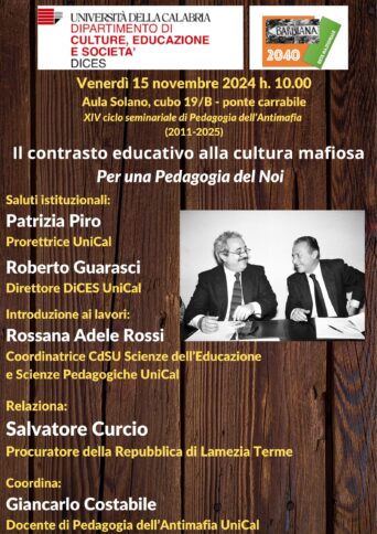 RENDE “Per una Pedagogia del Noi” è il tema del seminario organizzato nell’ambito delle attività del corso universitario di Pedagogia dell’Antimafia, attivo presso il dipartimento di Culture, Educazione e Società dell’Università della Calabria, che si terrà venerdì 15 novembre, alle 10.00, presso l’aula Solano dell’ateneo (cubo 19/B, ponte carrabile). Gli universitari di Scienze dell’Educazione incontreranno Salvatore Curcio, Procuratore della Repubblica di Lamezia Terme, per discutere le ragioni del contrasto educativo alla cultura mafiosa. L’incontro sarà aperto dai saluti istituzionali delle Autorità Accademiche: interverranno Patrizia Piro, Prorettrice UniCal, e Roberto Guarasci, Direttore del DiCES. Rossana Adele Rossi, Coordinatrice del Corso di Studio Unificato in Scienze dell’Educazione e Scienze Pedagogiche dell’ateneo, avvierà la discussione, coordinata da Giancarlo Costabile, docente di Antimafia al DiCES dell’UniCal. Il Procuratore Curcio sarà premiato nel corso dell’incontro per il suo importante contributo nella lotta ai poteri criminali.