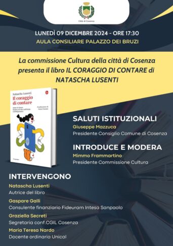 COSENZA La Commissione Cultura del Comune di Cosenza è lieta di presentare il libro Il coraggio di contare di Natascha Lusenti. Natascha Lusenti, giornalista di Radio Uno e autrice di grande sensibilità, racconta in questo libro storie di donne che hanno trasformato il denaro da semplice strumento economico a leva di cambiamento personale e sociale. Il coraggio di contare esplora il valore della consapevolezza economica come strumento di libertà, autodeterminazione e crescita, con un focus sul ruolo cruciale delle donne nell’affrontare e superare le sfide legate alla violenza economica.