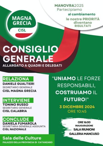 «In questo momento storico – afferma il segretario generale della CISL Magna Grecia Daniele Gualtieri presentando l’incontro – è fondamentale che il sindacato continui a unirsi e a rafforzare la propria capacità di rappresentanza. Le sfide del mondo del lavoro sono sempre più complesse, ma insieme possiamo affrontarle con determinazione e responsabilità. Il nostro obiettivo è costruire un futuro migliore per i lavoratori, per i giovani, per le donne, per le famiglie. Gran parte dei 30 miliardi della legge di bilancio sono concentrati su interventi coerenti con le richieste avanzate dalla Cisl al governo, e questo dimostra l’importanza del confronto nel merito dei contenuti, senza pregiudizi ideologici, con l’unico obiettivo di lavorare a difesa delle persone che il sindacato deve rappresentare e tutelare. Altri obiettivi sono da raggiungere sui temi delle politiche occupazionali, del welfare e della previdenza, in un confronto serio e determinato con il governo che abbia come unici obiettivi il miglioramento delle condizioni di lavoro e una maggiore equità sociale». Nel pomeriggio, alle ore 16:00, si terrà l’inaugurazione della nuova Sala Riunioni della CISL Magna Grecia all’interno della Galleria Mancuso, un ulteriore passo avanti per migliorare l’organizzazione e i servizi resi dalla CISL Magna Grecia a favore dei lavoratori e delle lavoratrici e dell’intera comunità.