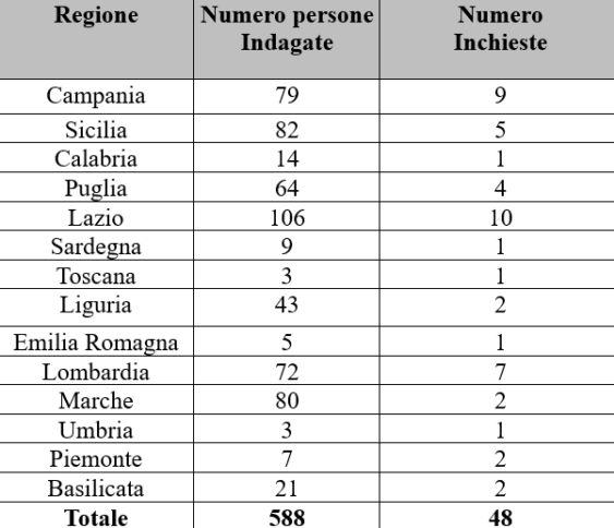Le regioni meridionali, isole comprese, primeggiano con 20 indagini in totale, seguite da quelle del Centro (16) e dal Nord (12). Prima in classifica il Lazio con 10 inchieste, seguita da Campania con 9, Lombardia con 7, Sicilia con 5 e Puglia con 4. In queste regioni si concentra il 74% delle inchieste. Ben 106 persone indagate sono nel Lazio, 82 in Sicilia, seguita dalle Marche con 80 indagati di cui ben 77 in una sola inchiesta su corruzione per finte vaccinazioni anticovid, 79 in Campania, Lombardia con 72 indagati, e Puglia, a quota 64. La mappa dell’ inchieste e il numero degli indagati, per i quali vale la presunzione di non colpevolezza, è frutto di una ricerca avente su lanci di agenzie, articoli su quotidiani, rassegne stampe istituzional , comunicati delle Procure e delle forze dell’ordine.