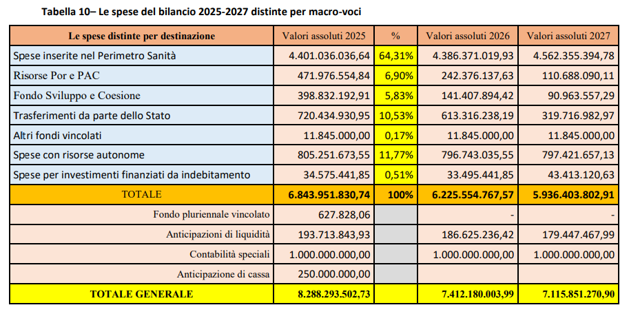 Il bilancio della Regione nella parte spesa – prosegue la relazione della Giunta – «vale circa 6,8 miliardi di euro, al netto delle contabilità speciali, delle anticipazioni di liquidità, del fondo pluriennale vincolato e dell’anticipazione di cassa. La distribuzione rispetto al vincolo non rispecchia in maniera speculare i valori evidenziati nella parte entrata, in ragione dell’incidenza del Fondo pluriennale vincolato e per la quota di risorse autonome che cofinanziano il Fse 2021-27 spalmata sui relativi capitoli della spesa. Si evince, pertanto, che il 64,3% circa è rappresentato da spese per la sanità. Le risorse per investimenti (Por e Fsc) rappresentano il 12,7% circa del bilancio di competenza, mentre il 10,7% circa riguarda altri fondi a destinazione vincolata. La spesa finanziata nel 2025 con risorse autonome rappresenta poco meno del 12% della spesa complessiva in termini di competenza totale».