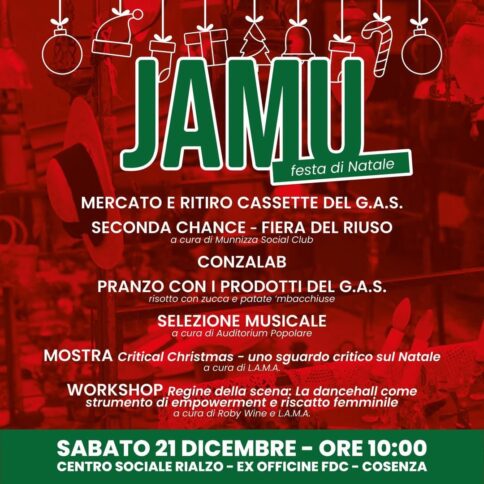 Si avrà, poi, la possibilità di riparare in maniera collettiva piccoli elettrodomestici o utensili elettronici rotti che si credono giunti a fine vita, con le attività settimanali del Conzalab. E ancora, verranno allestiti spazi di riflessione e di confronto, attraverso Critical Christmas – Uno sguardo critico sul Natale, una mostra di installazioni a tema natalizio create a partire da materiali di scarto e di recupero, evocative delle festività natalizie, ma che in modo originale capovolgono il tema del consumismo o della cecità nei confronti di guerre e temi di attualità che di solito ci caratterizza nei periodi di festività di questo tipo, organizzata dal collettivo artistico L.A.M.A., e il workshop Regine della scena: la dancehall come strumento di empowerment e riscatto femminile, organizzato da Roby Wine. L’intera giornata sarà accompagnata da un pranzo sociale, preparato con i prodotti del G.A.S., e dalle selezioni musicali, a cura dell’Auditorium Popolare.