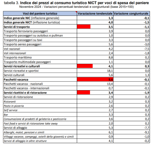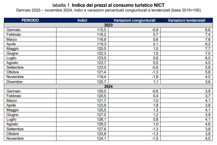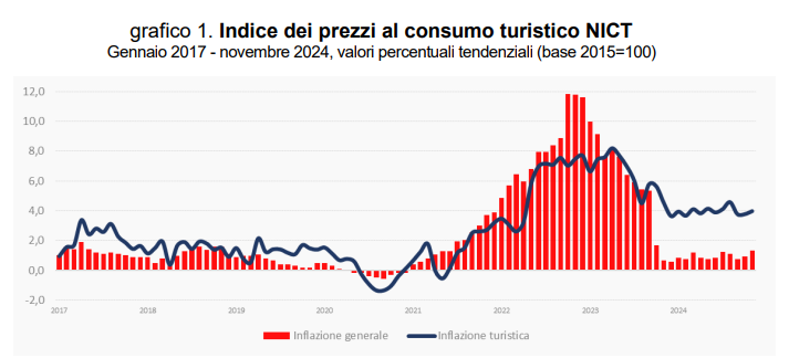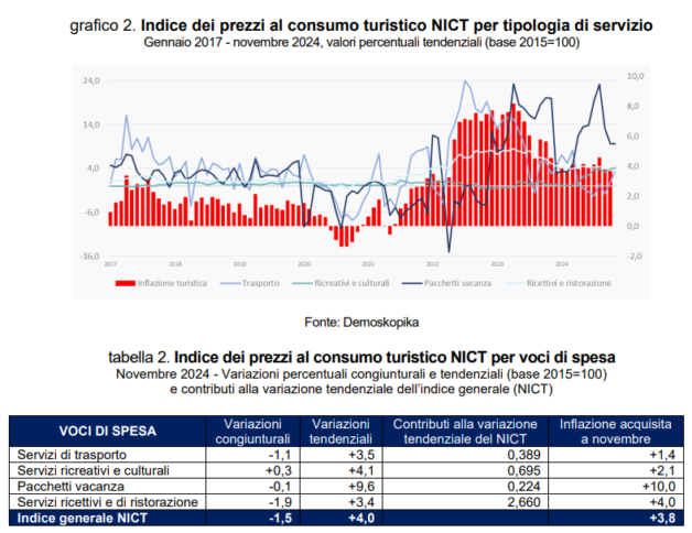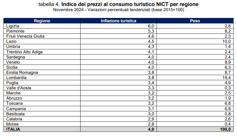 L’inflazione turistica acquisita per il 2024 è pari al 3,8%. Tra i primi sistemi regionali a registrare l’inflazione turistica tendenziale più elevata, e comunque al di sopra del valore medio italiano, si collocano Liguria (6,0%), seguita da Piemonte (5,3%), Friuli Venezia Giulia (4,6%), Lazio (4,5%), Umbria (4,3%) e Trentino Alto Adige (4,1%). Sul versante opposto la dinamica dei prezzi più contenuta si registra prevalentemente nelle seguenti regioni: Molise (2,8%), Calabria (2,9%), e Basilicata (3,0%). La dinamica dell’indice armonizzato dei prezzi al consumo turistico (Ipcat) per l’Italia fa registrare nel mese di novembre 2024, su base annua, un aumento del 4,1% (in crescita rispetto al mese di ottobre 2024, +3,9%) a fronte del dato dell’Unione Europea pari al 4,8%.