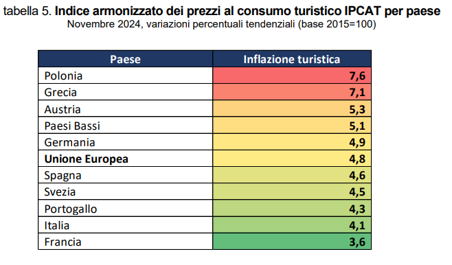 In base alle stime di Demoskopika, infine, l’indice armonizzato dei prezzi al consumo turistico (IPCAT) per l’Italia, sviluppato per assicurare una misura dell’inflazione comparabile a livello europeo, registra, nel mese di novembre 2024, una crescita su base annua dal 4,1% a fronte di un 4,8% dell’Unione Europea. Una dinamica dei prezzi del “paniere turistico” che colloca il Belpaese al penultimo posto tra le aree “meno inflazionate”, preceduto dalla sola Francia (3,6%). Sul, versante opposto, a presentare, infine, un andamento dell’inflazione turistica più elevato dell’Italia tutte le rimanenti destinazioni osservate: Polonia (7,6%), Grecia (7,1%), Austria (5,3%), Paesi Bassi (5,1%), Germania (4,9%), Spagna (4,6%), Svezia (4,5%) e, infine, Portogallo (4,3%).