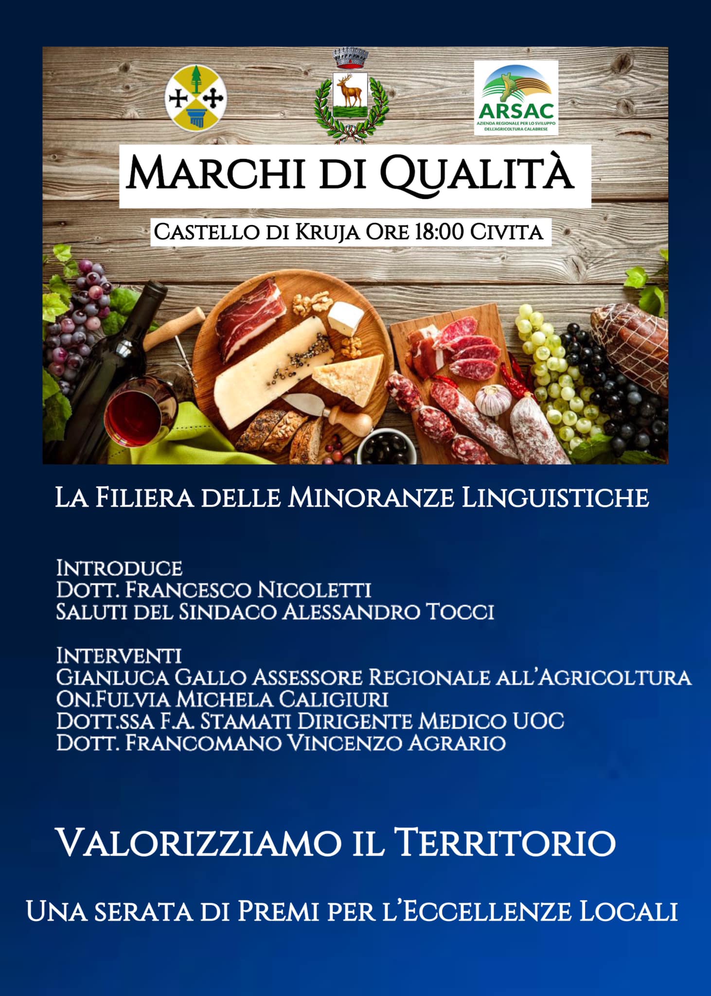 CIVITA Il Comune di Civita, con il patrocinio della Regione Calabria e dell’ARSAC (Agenzia Regionale per i Servizi in Agricoltura della Calabria), ha lanciato il progetto “Marchi di Qualità”. Questa iniziativa mira a valorizzare e promuovere le eccellenze del territorio calabrese, unendo tradizione e innovazione attraverso un marchio distintivo che garantisce alta qualità e autenticità.