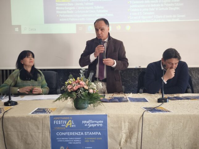 VIBO VALENTIA Si terrà a Vibo Valentia dal 13 al 16 gennaio il Festival delle Arti, organizzato dall’Istituto Morello Colao e arrivato alla quinta edizione. Protagonisti gli studenti del Liceo Classico e del Liceo Artistico, che hanno curato il programma, gli incontri e l’organizzazione. L’evento è stato presentato stamattina nell’Aula Magna della scuola di Via XXV Aprile dal dirigente scolastico Raffaele Suppa e dalla professoressa, nonché curatrice del Festival, Maria Concetta Preta, con la moderazione di Tonino Fortuna. “Mediterraneo da scoprire” è il tema scelto per quest’anno con incontri dedicati alla pittura, all’arte, al cinema, alla musica, oltre ai vari temi di attualità. Grande attesa per gli ospiti che si succederanno tra un incontro e un altro: per l’inaugurazione ci sarà Bernard Dika, seguiranno incontri con prestigiosi autori come Vito Teti, Mimmo Gangemi e Domenico Dara. Ma ci sarà spazio anche per un omaggio allo storico attore Raf Vallone, ai racconti di Vincenzo Chindamo, fratello di Maria uccisa dalla ‘ndrangheta, alle esibizioni musicali di Maria Teresa Ionadi.