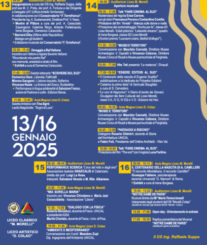 «Quattro giorni di Festival per coinvolgere alunni, istituzioni e riflettere su questa modernità e sull’attualità» afferma a margine della conferenza il dirigente scolastico Raffaele Suppa. L’inaugurazione è prevista per il 13 gennaio con ospite l’Alfiere della Repubblica, il giovanissimo Bernard Dika, e un’esibizione musicale del Conservatorio Torrefranca. «Parleremo di arte, parleremo di cultura, di letteratura, di cinema, di teatro, di musica, di tanti eventi e di tante opere letterarie presentate dai loro autori». Non solo il conservatorio, ma anche altre realtà vibonesi verranno coinvolte, come le associazioni e i musei. «Riteniamo che la scuola sia il luogo centrale per promuovere iniziative ed eventi culturali di alto profilo». Quindi l’invito a tutta la cittadinanza a «partecipare con noi a queste quattro giornate, a lasciarsi fecondare da questa nuova modalità di fare istruzione, fare didattica, fare cultura consentendo ai nostri studenti, a questa generazione di esprimersi al meglio».