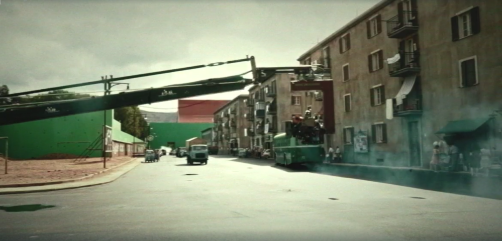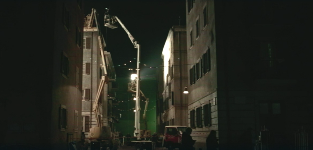 Il Rione Luzzatti citato nella quadrilogia edita da e/o, luogo reale della periferia est di Napoli, è stato completamente ricostruito in appena tre mesi su un’area di 25mila metri quadrati a Marcianise (Caserta) nell’ex fabbrica Saint-Gobain: è qui che, nell’opera di Scalercio, scivolano le presenze e le suggestioni del set restituendo tutto il fascino della settima arte, tra i silenzi e gli echi che si fanno largo tra i rumori di scena.
