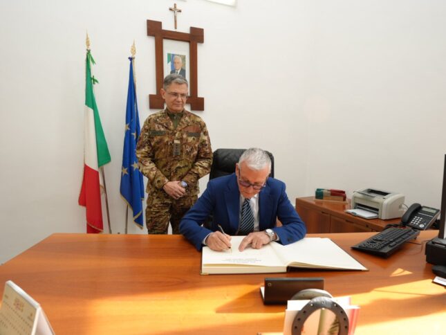 CATANZARO Nel corso della mattinata il Prefetto di Catanzaro Castrese De Rosa ha visitato il Comando Militare Esercito “Calabria”. Accolto dal Comandante, Colonnello Ugo Gaeta e dal Sottufficiale di Corpo, 1° Lgt. Giovanni Portolesi, il Prefetto ha incontrato i diretti responsabili delle unità organizzative del Comando ed ha seguito, con particolare interesse, un briefing volto ad illustrare i compiti istituzionali, le principali attività correnti e le progettualità di breve/medio termine che il Comando svilupperà sul territorio regionale. In tale contesto, particolare attenzione è stata posta nelle possibili sinergie istituzionali e forme di cooperazione dell’Esercito a favore di altri Dicasteri in caso di emergenze e di pubbliche calamità naturali nell’ambito del servizio nazionale della Protezione civile. La visita è proseguita con un sopralluogo delle principali infrastrutture di interesse storico site nel comprensorio militare e si è conclusa con la firma dell’Albo d’Onore, sul quale il Prefetto, nel trascrivere parole di apprezzamento per le molteplici attività svolte dal Comando, ha sottolineato altresì come risulti essenziale la cooperazione tra Autorità civili e militari, auspicando, in tal senso, una proficua collaborazione durante il suo mandato.