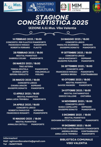 «L’obiettivo è valorizzare i giovani musicisti del territorio e il territorio con questo progetto culturale» spiega il direttore artistico maestro Andrea Brissa. Un palcoscenico per talenti del Vibonese, «ma anche di tutto il territorio regionale». Il programma, spiega il maestro, spazierà in vari generi, tra jazz, musica classica e lirica che «abbiamo notato essere molto apprezzata dal pubblico, oltre a far parte della nostra storia». Per gli spettacoli sarà richiesto un contributo minimo di 5 euro, «con spettacoli che partiranno da febbraio e avranno più meno una cadenza di due volte al mese, con una pausa nel periodo estivo. L’anno scorso abbiamo avuto un bel successo, la comunità vibonese è assetata di cultura, vogliamo continuare su questa strada e ci aspettiamo un pubblico numeroso e accogliente».