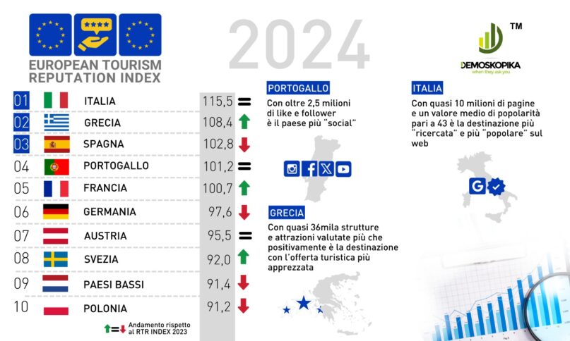È l’Italia a confermare, per il secondo anno consecutivo, il primato europeo nella classifica generale dell’ European Tourism Reputation Index (ETR Index) ideato dall’Istituto Demoskopika che, utilizzando lo stesso approccio metodologico del Regional Tourism Reputation Index (RTR Index), è finalizzato a offrire ai portatori di interesse ulteriore confronto anche tra le principali destinazioni turistiche europee. In particolare, sono state individuate le prime dieci destinazioni per arrivi in base agli ultimi dati disponibili (Eurostat, 2023): Francia, Germania, Spagna, Italia, Paesi Bassi, Austria, Polonia, Svezia, Grecia e Portogallo.