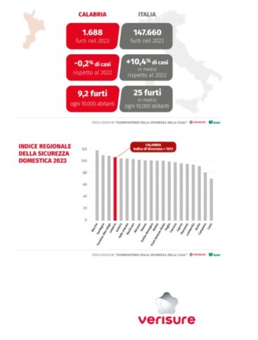 CATANZARO Con 1.688 furti registrati nel 2023 e un tasso di 9,2 furti ogni 10.000 abitanti (-0,2% rispetto al 2022), la Calabria si posiziona tra le regioni meno colpite d’Italia, con 15,8 punti in meno rispetto alla media nazionale. È quanto emerge dalla terza edizione dell’Osservatorio sulla Sicurezza della Casa Censis-Verisure, realizzato con il contributo del Servizio analisi criminale del Ministero dell’Interno, secondo cui il furto in casa è il reato che suscita maggiore preoccupazione tra gli italiani: il 48% della popolazione lo considera la principale fonte di inquietudine.