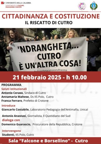 CUTRO Terza tappa del progetto di Pedagogia dell’Antimafia a Cutro, organizzato in collaborazione tra il Dipartimento di Culture, Educazione e Società dell’Università della Calabria, il Comune, l’I.I.S. Polo di Cutro e inaugurato il 18 novembre 2024. Dopo i primi due incontri che hanno visto dialogare gli studenti e le studentesse della scuola con il Procuratore della D.D.A. di Catanzaro, Vincenzo Capomolla, e con Beniamino Fazio, Capo centro operativo della Direzione Investigativa Antimafia per il Distretto di Catanzaro, adesso toccherà al Procuratore di Crotone, Domenico Guarascio, confrontarsi con i ragazzi di Cutro. L’iniziativa si terrà domani, venerdì 21 febbraio, alle 10.00 presso la Sala Falcone-Borsellino del Comune. A portare i saluti istituzionali saranno il Sindaco Antonio Ceraso, Annamaria Maltese, Dirigente scolastica dell’I.I.S. Polo, e Franca Ferraro, Prefetto di Crotone. Giancarlo Costabile, docente di Pedagogia dell’Antimafia all’UniCal, introdurrà i lavori del seminario che sarà coordinato dal giornalista e scrittore, Antonio Anastasi.