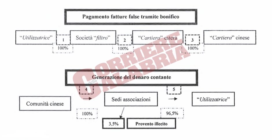 L’inchiesta ha dunque acceso i riflettori su un sistema sempre più consolidato e che vede la collaborazione proficua tra i clan calabresi e la comunità cinese. Come emerso dalle indagini, infatti, una volta accreditato l’importo sul conto corrente della società di diritto cinese, avviene quella che i finanzieri definiscono “monetizzazione” della fattura, vale a dire la fornitura da parte di soggetti appartenenti alla comunità cinese di Milano «di denaro contante per un importo corrispondente alla fattura originariamente pagata dalla società “cliente”». I componenti del gruppo criminale trattengono per il servizio reso l’importo del 3,5% – corrispondente al profitto del reato – da suddividere poi fra i membri del sodalizio. Seguendo questa schema, alla originaria società “cliente”, arriva denaro contante per il restante 96,5% dell’importo nominale della fattura pagata, con conseguente evidente e importante risparmio in termini di spesa fiscale.