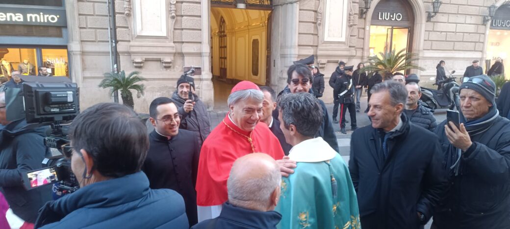 CATANZARO «Un abbraccio che ricambio con tutto il cuore, perché è bellissimo essere qui dopo tanto tempo». A Catanzaro don Mimmo Battaglia è “don Mimmo Battaglia” prima ancora che cardinale, il cardinale che oggi guida la chiesa di Napoli ma che a Catanzaro ha lanciato i semi della sua missione pastorale. E Catanzaro accoglie don Mimmo Battaglia con un abbraccio che è segno di amore ma anche di ringraziamento per l’opera che il prete degli ultimi ha svolto qui e ora svolge nella chiesa con un impegno e uno sforzo universali. Accolto dall’arcivescovo metropolita di Catanzaro Squillace, monsignor Claudio Maniago, il cardinale Battaglia ha tenuto nella Basilica dell’Immacolata del capoluogo una solenne celebrazione eucaristica – la sua prima messa da Cardinale – che è stata anche un’occasione davvero speciale «per pregare per la salute del Santo Padre Francesco e per ringraziare il Signore per la scelta del Pontefice, che rappresenta un dono per tutta la Chiesa e in particolare per la comunità calabrese», ha riferito monsignor Maniago.