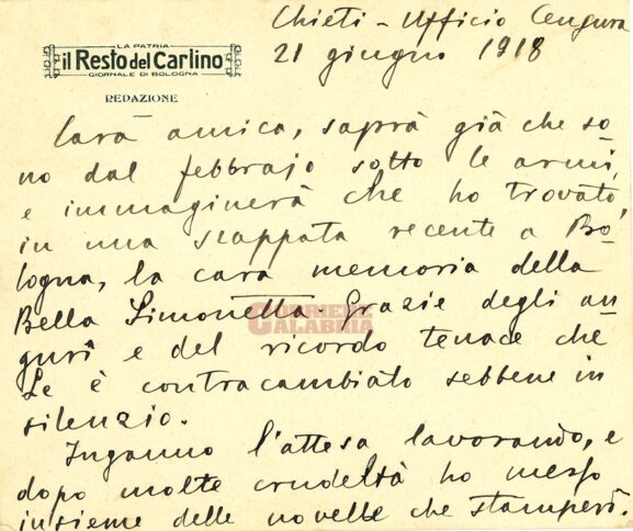 Su carta intestata de «Il Resto del Carlino», Bologna 9 gennaio 1917, Alvaro scrive alla Puccini: «Amica carissima, mi dispiace che sia così sola e tanto più triste di prima. La ringrazio delle buone parole che ha per me e le mando un’altra novella. Sono qui redattore e lavoro se non con la gioia degli anni passati, almeno con accanimento. Lo sa? Le Grigioverdi le aspetto in libro da un giorno all’altro. Gliele manderò. Io qui vado a lavorare alle 9 ed esco alle 2 di mattina e son contento perché sono già a un giornale dove non speravo di entrare se non in età tarda. La giornata la passo a lavorare per me. Conosco poco Bologna e son diventato egoista. Prendo il the solo solo, accanto alla stufa, ho bella carta, bell’inchiostro, penne leggere. E non ho amici, e non luoghi dove andar la sera. Mentre la vita di contatto col mondo a Firenze mi irrobustiva, a Roma mi esauriva. Ora invece son calmo e tranquillo e chiuso in un egoismo come io non conoscevo. Invecchio? Se passerò da Firenze verrò, ma credo che sarà per Pasqua. Le scriverò spesso, le manderò mie nuove, cose mie, e vorrei tenerle tanta compagnia buona, più buona di quella che le tenevo. E l’Impruneta? A Roma vidi le Carmignani, da Aragno, ma non mi hanno riconosciuto. E si che son cambiato parecchio. Le stringo affettuosamente la mano. Saluti ai suoi. Alvaro».