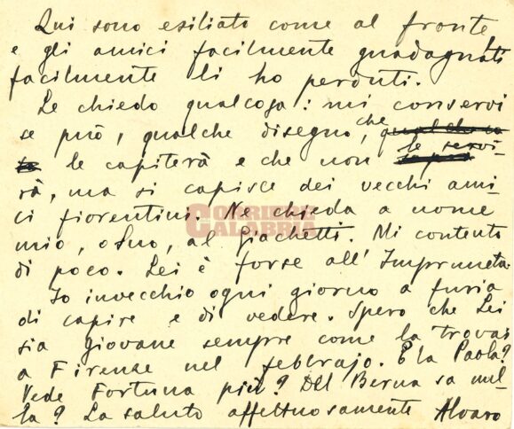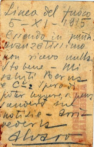 «Gentilissima signorina, spero che questo mio trovi il cielo imprunetino serenissimo […]. Le scrivo dalla tenda dove se anche lontano il rombo dei cannoni così pronti a cantarci un po’ di ninnananna quando eravamo sulle prime linee del fuoco. Hanno anche gli orari. P. es. alle 8 (pigri) sveglia di 149 (che i nostri chiamano carretti da battaglione). Alle 10 una 40ina di colpi a caso tanto per pescare qualcuno. Alle 12 un po’ di noia a chi mangia con i 75 (“pettegoli”). Alle 4 molestie di granate ai feriti e ai portaferiti, alle 6 «buona sera» di 25 (treni merci). Alle 7 silenzio e fuoco di fucileria. Conclusione: La metà dei colpi non esplodono, l’altra metà fa cilecca, uno per cento tocca a chi tocca. E si ride di gusto. Smetto perché non ho posto più. Alvaro Sott. Le 122 M. M. 5a Compagnia Zona di guerra».