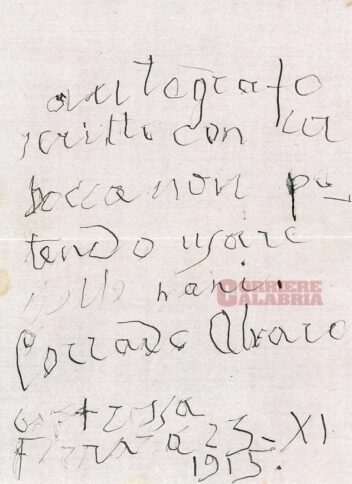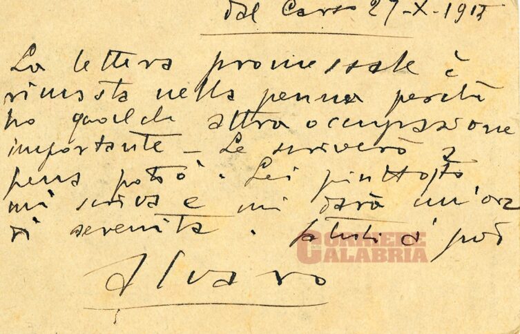 L’anziano canonico, da S. Luca 28 agosto 1915, invia a Corrado Alvaro, sottotenente al 122° Battaglione M. M., Zona di Guerra, una lettera in cui, assieme a tanta retorica e erudizione tipiche del periodo e dell’intellettualità locale, c’è tanta premura e tanto affetto: