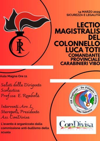 VIBO VALENTIA Il giorno 14 Marzo alle ore 11.00 presso l’aula magna del Polo Professionale di Vibo Valentia si terrà la lectio Magistralis del Colonnello Luca Toti Comandante Provinciale Carabinieri di Vibo Valentia : All’inizio dell’incontro, organizzato dalla commissione antibullismo del polo Professionale di Vibo Valentia è previsto il saluto della Dirigente Eleonora Rombola e l’intervento dell’avvocato Rosalia Staropoli, presidente dell’associazione “ConDivisa -Sicurezza e Giustizia”. A moderare l’incontro saranno le professoresse Giovanna Esposito e Mariateresa Sirgiovanni. «I Carabinieri sono il primo presidio di legalità e di sicurezza sul nostro territorio» Spiega l’avvocato Staropoli. «Anche il più piccolo dei paesi può contare sulla propria Stazione dei Carabinieri, il Comandante Provinciale Luca Toti si occupa di coordinare le azioni di ogni reparto provinciale, dalle indagini per le imponenti operazioni antimafia al riscontro dei reati meno complessi, ma che costituiscono sempre una minaccia alla sicurezza dei cittadini».