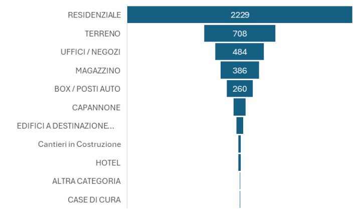 «Un dato interessante è rappresentato dall’interesse degli investitori esteri, che si concentra principalmente su case situate in zone turistiche e vacanziere. Questi immobili, spesso vicini al mare o in località di richiamo, attraggono acquirenti stranieri alla ricerca di proprietà per uso personale o investimento. Rispetto al mercato libero, una delle principali differenze nelle aste riguarda l’occupazione degli immobili, un fattore che può rappresentare un ostacolo per gli acquirenti. Nonostante ciò, le aste immobiliari continuano a offrire opportunità per chi è disposto a superare le difficoltà legate a questo tipo di compravendita». Per quanto concerne la suddivisione per tipologia dei lotti in vendita, il residenziale rappresenta il 51%, in linea con la media nazionale, mentre colpisce la presenza di terreni in asta: 708 lotti pari al 16,34% rispetto al 12,99% nazionale.