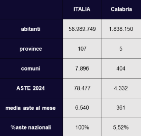 Sono 78.477 le unità immobiliari oggetto di asta in Italia nel 2024 (con un controvalore di base d’asta complessivo pari a 10.887.445.116,31 euro e offerte minime per 7.422.657.128,83) con un decremento di circa il 12% rispetto all’anno precedente (quando si sono registrate 88.174 unità in asta). Lo rende noto il Centro studi RINA Prime nel suo “Report Aste 2024”. Nel 2024 la Calabria si colloca all’ottavo posto nella classifica delle regioni con maggior numero di vendite giudiziarie, il che significa 361 aste al mese (5,52% delle unità immobiliari all’asta in Italia). Nel 2023 la Regione si collocava infatti all’undicesimo posto con 4371 aste (4,9%), così come nel 2022 con 5062 aste (4,48% del totale Italia).