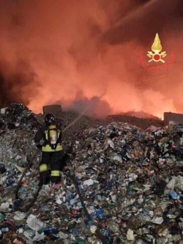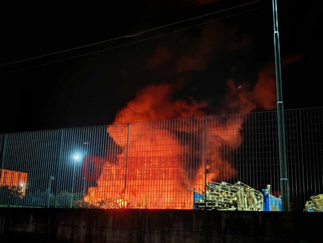 GIZZERIA Un vasto incendio si è sviluppato questa sera in Contrada Mortilla, nel Comune di Gizzeria in provincia di Catanzaro. Le fiamme, altissime, in particolare, stanno interessando gli esterni di un’azienda che gestisce lo smaltimento di rifiuti solidi urbani (materiale plastico) nella zona industriale.