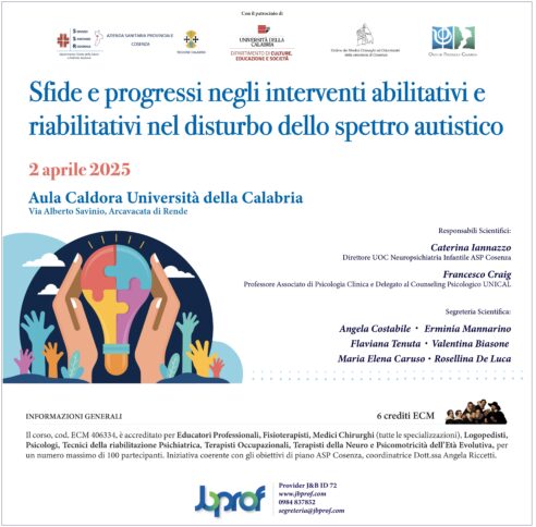 COSENZA Si svolgerà il prossimo 2 aprile, in occasione della Giornata Mondiale per la consapevolezza sull’Autismo, il convegno sulle sfide e i progressi degli interventi riabilitativi nei disturbi dello spettro autistico. Il simposio, promosso dalla dr.ssa Caterina Iannazzo – direttore della Uoc di Neuropsichiatria Infantile dell’Asp – e dal prof. Francesco Craig – associato di Psicologia Clinica e delegato Counseling psicologico dell’ Unical – farà il punto sulle più recenti evidenze scientifiche e le migliori esperienze nei percorsi terapeutici e riabilitativi dei soggetti affetti da patologia dello spettro autistico.