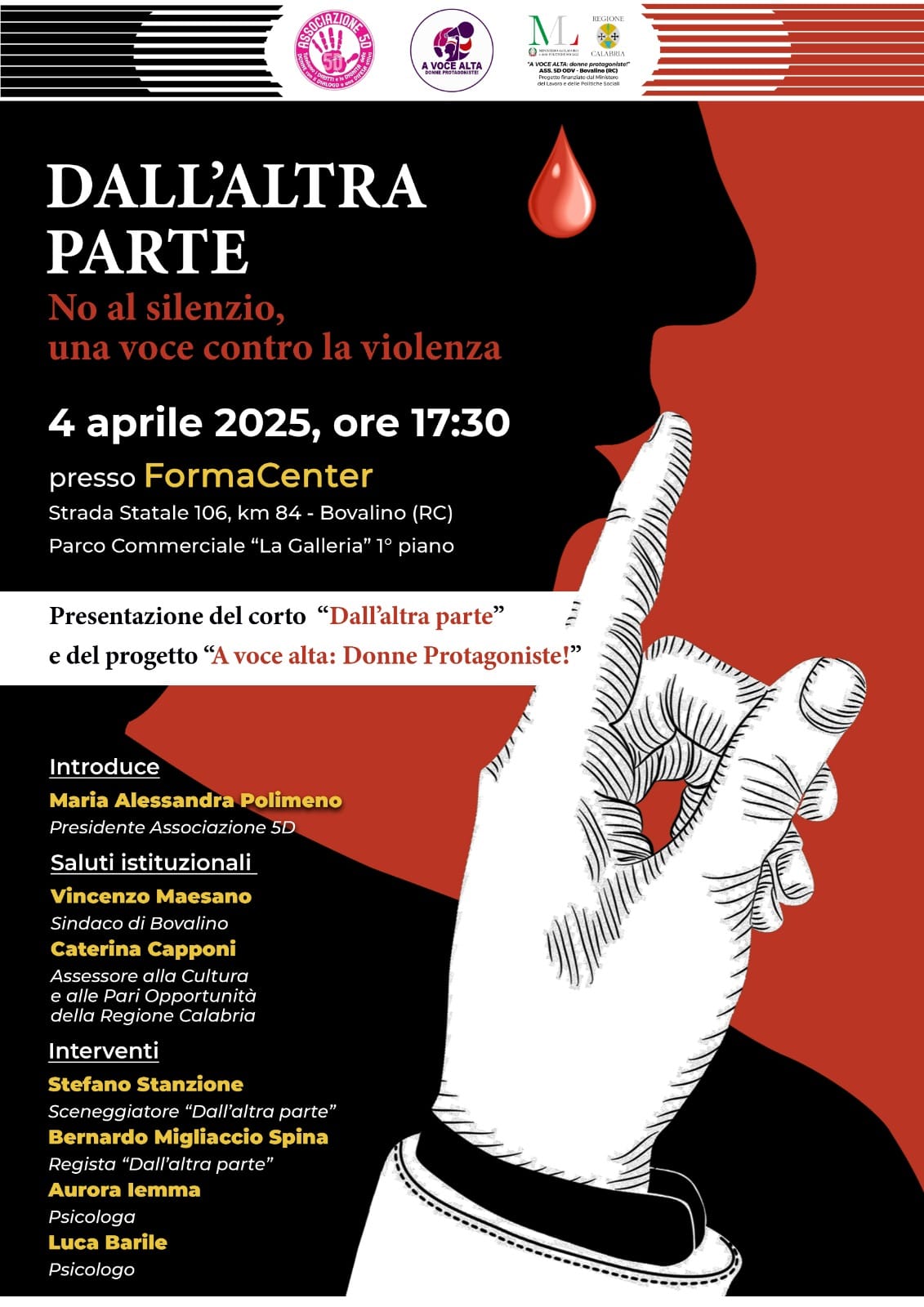 BOVALINO Venerdì 4 aprile 2025 alle ore 17:30, presso il FormaCenter di Bovalino (Parco Commerciale “La Galleria”, primo piano), sarà presentato al pubblico il cortometraggio “Dall’altra parte”, una produzione multimediale intensa e profondamente simbolica, nata per portare alla luce una delle forme più subdole e meno riconosciute della violenza di genere: quella psicologica.