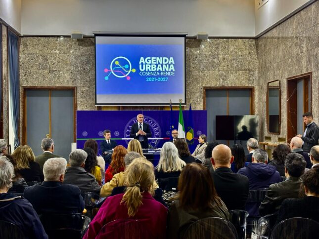 COSENZA In un gremitissimo salone di rappresentanza di Palazzo dei Bruzi, affollato da un partenariato diffuso, con associazioni, operatori economici, gruppi di interesse, sindacati, cittadini, oltre ai rappresentanti degli enti e delle associazioni di categoria che hanno rinnovato la loro partecipazione, si è consumato questa mattina il primo atto della strategia che l’Amministrazione comunale di Cosenza, con in testa il Sindaco Franz Caruso, sta mettendo a punto per la nuova Agenda Urbana Cosenza-Rende 2021-2027 che il primo cittadino preferisce chiamare “Agenda Urbana 2”, la seconda programmazione che Franz Caruso gestisce direttamente. Con il Sindaco, presenti all’incontro con il partenariato, anche il consigliere delegato ad Agenda Urbana, Francesco Alimena, gli assessori di riferimento dei diversi ambiti coinvolti nella definizione della strategia di sviluppo urbano sostenibile, dal Vicesindaco Maria Locanto, per l’ambiente, a Pina Incarnato, per l’Urbanistica, a Damiano Covelli, per i lavori pubblici, a Veronica Buffone, per il welfare. Al tavolo, accanto al Sindaco, anche il Dirigente del settore Infrastrutture e Lavori pubblici, ing.Salvatore Modesto e, sempre per il settore, l’ing.Maria Colucci.