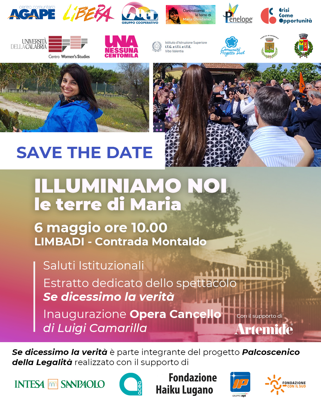 Illuminare il 6 maggio non è solo un gesto simbolico, è un atto politico, culturale, umano. È un’azione che unisce memoria e futuro. «Il 6 maggio, giorno in cui è scomparsa Maria, è ormai una data simbolo per la Calabria: parla di libertà, di diritti, di vita. Proprio come desideravamo quando abbiamo fondato il comitato, da questo luogo riusciamo a raggiungere le coscienze di tanta gente creando una memoria collettiva volta al cambiamento» commenta Nancy Cassalia del Comitato “Controlliamo noi le terre di Maria”. Quotidiano è il loro impegno per trasformare un luogo segnato dalla violenza in uno spazio di luce, memoria e rinascita. A contribuire è anche Crisi Come Opportunità, la cui fondatrice e vicepresidente Giulia Minoli dichiara «dal 2018, siamo presenti sul territorio calabrese con percorsi dedicati a legalità, educazione di genere e giustizia minorile, in collaborazione con i partner locali. Promuoviamo la cultura e realtà positive di riscatto. Accendiamo i riflettori su nuovi modelli di riferimento, proprio come Maria Chindamo, grazie al sostegno di Intesa Sanpaolo, Fondazione con il Sud, Fondazione Haiku, IP Gruppo API e Acea».