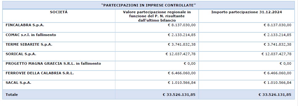 Nella relazione si specifica poi che «nel corso dell’anno 2024 si è conclusa la procedura concorsuale della società “Aeroporto S. Anna Spa in fallimento” con la definitiva cancellazione della società dal Registro Imprese e la trasformazione della società “Tech4you S.c.r.l” in “Consorzio Tech4you”; sempre nell’anno 2024 sono state iscritte… le partecipazioni detenute nella Fondazione “Istituto regionale per la comunità Occitana di Calabria” e nella Fondazione “Istituto regionale per la comunità Grecanica di Calabria” a seguito della operatività delle stesse intervenuta in corso d’anno». L’asset delle partecipazioni regionali – si rimarca poi – «è composto da “Partecipazioni in imprese Partecipate” pari ad euro 11.487.032,70, da “Partecipazioni in imprese Controllate” pari ad euro 33.526.131,85 e da “Partecipazioni in altri soggetti” pari ad euro 2.013.960,00». Per quanto riguarda poi il Rendiconto 2024, nessun accantonamento del risultato di amministrazione è stato previsto per le società che non hanno perdite “portate a nuovo” (Banca Popolare Etica Spa, Comalca, Ferrovie della Calabria,, Sorical, Terme Sibarite, Stretto di Messina), né per le società che si trovano in stato di liquidazione o fallimento (Comac in fallimento, Comarc in liquidazione, Consorzio Cies in fallimento, Progetto Magna Graecia in fallimento, e Sogas in fallimento): gli accantonamenti riguardano invece le società che nel corso degli anni hanno evidenziato perdite non ripianate e “portate a nuovo”, e cioè Fincalabra (per euro 2.786.192,00), Sacal (8.454.711,26 euro) e Consorzio Tech4you (14.259,78 euro). (a. c.)