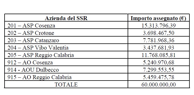 CATANZARO Arriva una importante iniezione di liquidità per le aziende sanitarie e ospedaliere della Calabria. Con un decreto adottato nei giorni scorsi il presidente e della Regione Roberto Occhiuto, nella sua qualità di commissario della sanità calabrese, ha disposto la ripartizione del Contributo di Solidarietà, lo speciale finanziamento previsto dal “Decreto Calabria” finalizzato a supportare gli interventi di potenziamento del Servizio sanitario calabrese. Si tratta in pratica del “tesoretto” che la legislazione straordinaria nazionale ha assegnato alla Calabria in virtù della gestione commissariale e straordinaria del settore. Il Contributo di solidarietà ripartito dal decreto commissariale si riferisce all’annualità 2022 ed è pari complessivamente a 60 milioni: il riparto avviene per il 70% delle risorse – pari a euro 42 milioni – sulla base della quota capitaria (popolazione all’1 gennaio 2024) e per il 30% delle risorse – pari a euro 18 milioni – sulla base della produzione sanitaria anno 2024 (flusso Asa e Sdo). Sulla base di questi criteri, l’assegnazione maggiore spetta all’Asp di Cosenza, con 15 milioni. Il riparto è consultabile nella tabella in basso. (c. a.)